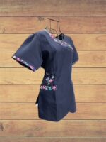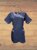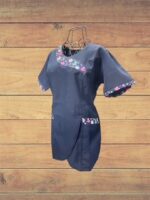 Delantal azul marino con aplicaciones primaverales, cierre medio en espalda, tela bistrech.