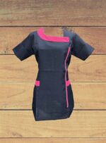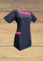 Delantal azul marino con aplicaciones fucsias y cierre al costado. Tela bistrech.