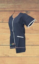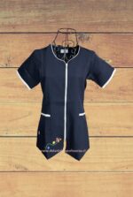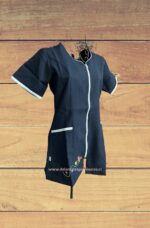 Delantal azul marino con cierre, bordado de flores y mariposa. Tela bistrech.