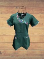 Delantal verde modelo campanita, aplicaciones primaverales. Cierre medio en espalda, tela bistrech.
