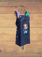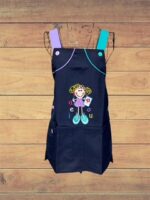 Jardinera azul marino con bordado de muñeca. Posee dos bolsillos, tela bistrech, modelo abotonado al costado y regulable.