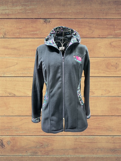 Chaqueta de polar azul hojitas. Bordado de caracol, bolsillos en los costados.