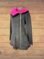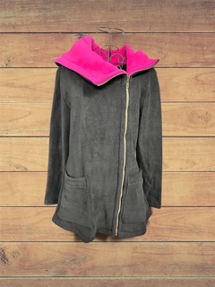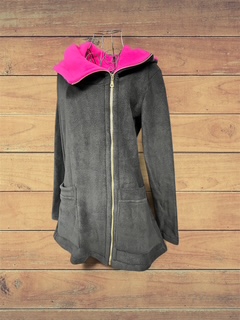 Chaqueta de polar negra con aplicaciones fucsia en gorro.