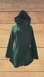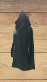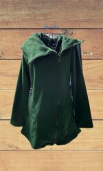 Abrigo de polar verde con capucha, cierre y bolsillos en costados.